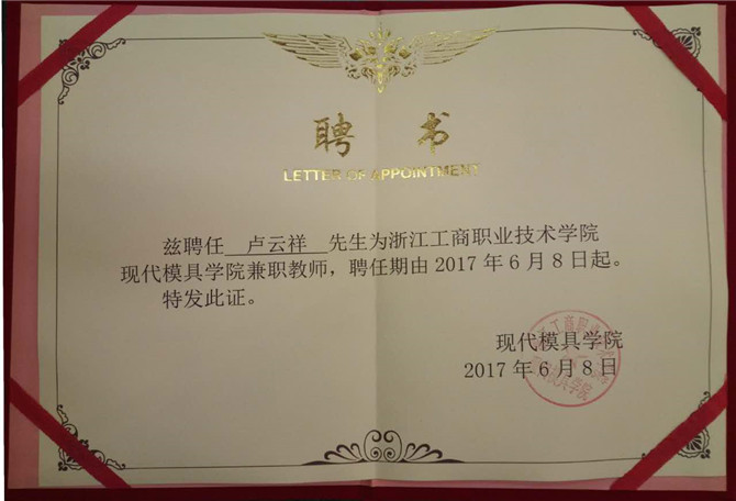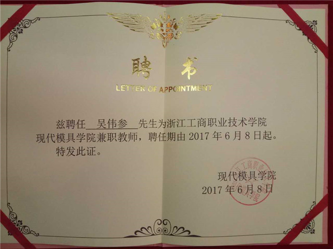 自(zi)2010年華寶公司(si)與浙江工(gong)(gong)商職(zhi)(zhi)業(ye)技術(shu)學(xue)院(yuan)(yuan)校企合作以來,華寶模(mo)具事(shi)業(ye)部(bu)涌現(xian)出(chu)一大批具備兼職(zhi)(zhi)教(jiao)師(shi)資(zi)格的(de)資(zi)深骨干(gan),他(ta)們被工(gong)(gong)商學(xue)院(yuan)(yuan)聘(pin)任為(wei)兼職(zhi)(zhi)教(jiao)師(shi)。2017年6月8日(ri),華寶股份又有四位同志被浙江工(gong)(gong)商職(zhi)(zhi)業(ye)技術(shu)學(xue)院(yuan)(yuan)寧海分院(yuan)(yuan)聘(pin)為(wei)現(xian)代模(mo)具兼職(zhi)(zhi)教(jiao)師(shi),他(ta)們分別是(shi)林(lin)和(he)芬、盧云祥、林(lin)長(chang)宏、吳(wu)偉參。