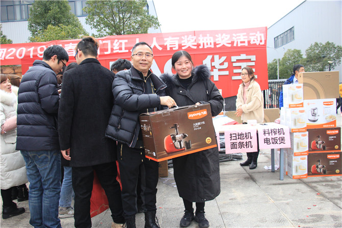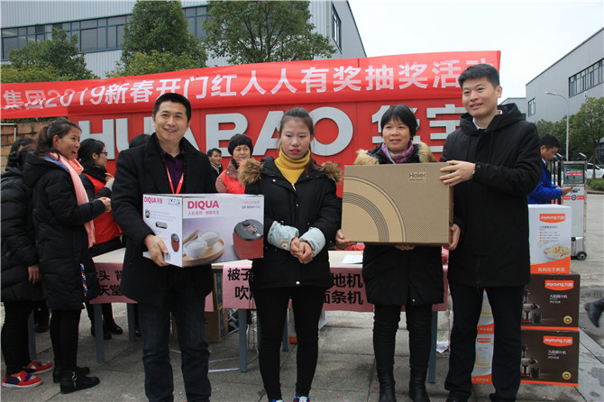 華寶(bao)公(gong)司為了迎接和感(gan)謝2018年的(de)辛勤付出及時返(fan)崗(gang)的(de)員(yuan)工(gong),在董事長胡仁寶(bao)先生的(de)親(qin)自帶領(ling)下,公(gong)司為員(yuan)工(gong)精心準備了豐厚的(de)獎品(pin):大到面條機、掃地機、電飯煲,小到被子、毛毯、背包、四(si)件(jian)套、開水煲、電吹風(feng)、雨傘等等只要到場便人(ren)人(ren)有獎。