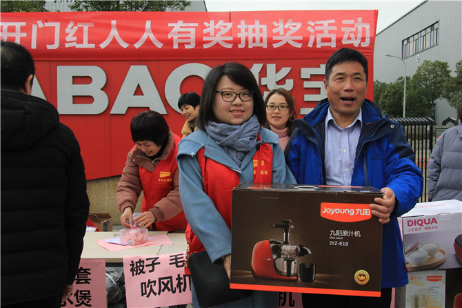 華寶公(gong)司為了(le)迎(ying)接和感(gan)謝2018年(nian)的(de)(de)辛(xin)勤付出及時返(fan)崗的(de)(de)員(yuan)(yuan)工(gong),在董(dong)事長(chang)胡(hu)仁寶先生的(de)(de)親自帶領下(xia),公(gong)司為員(yuan)(yuan)工(gong)精心準備了(le)豐厚的(de)(de)獎品:大到面條機(ji)、掃地機(ji)、電飯(fan)煲,小到被子、毛毯、背(bei)包(bao)、四件(jian)套、開水煲、電吹風、雨傘(san)等等只要到場便人(ren)人(ren)有獎。